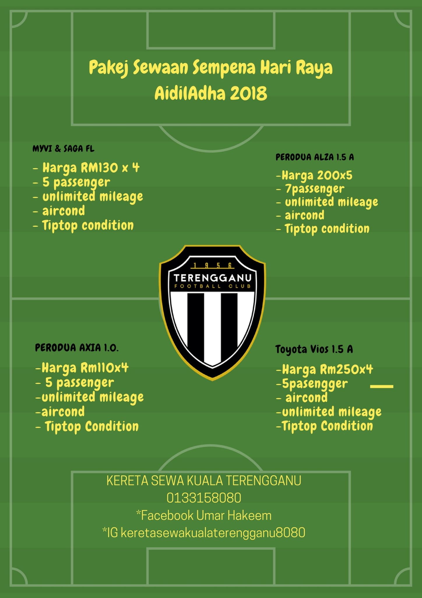 Sebarang pertanyaan tentang harga atau tempahan tentang kereta sewa anda boleh direct ke premis kami di Pengadang BAru , berhadapan trafic light desa murni bersebelahan dengan pakaian sekolah. Kalau duduk Terengganu confirm tahu nie hehe.. Ataupom anda boleh Call , WhattApss saya di talian 013-3158080 untuk lebih mudah berhubung. Jangan Lupa tagline syarikat kami.